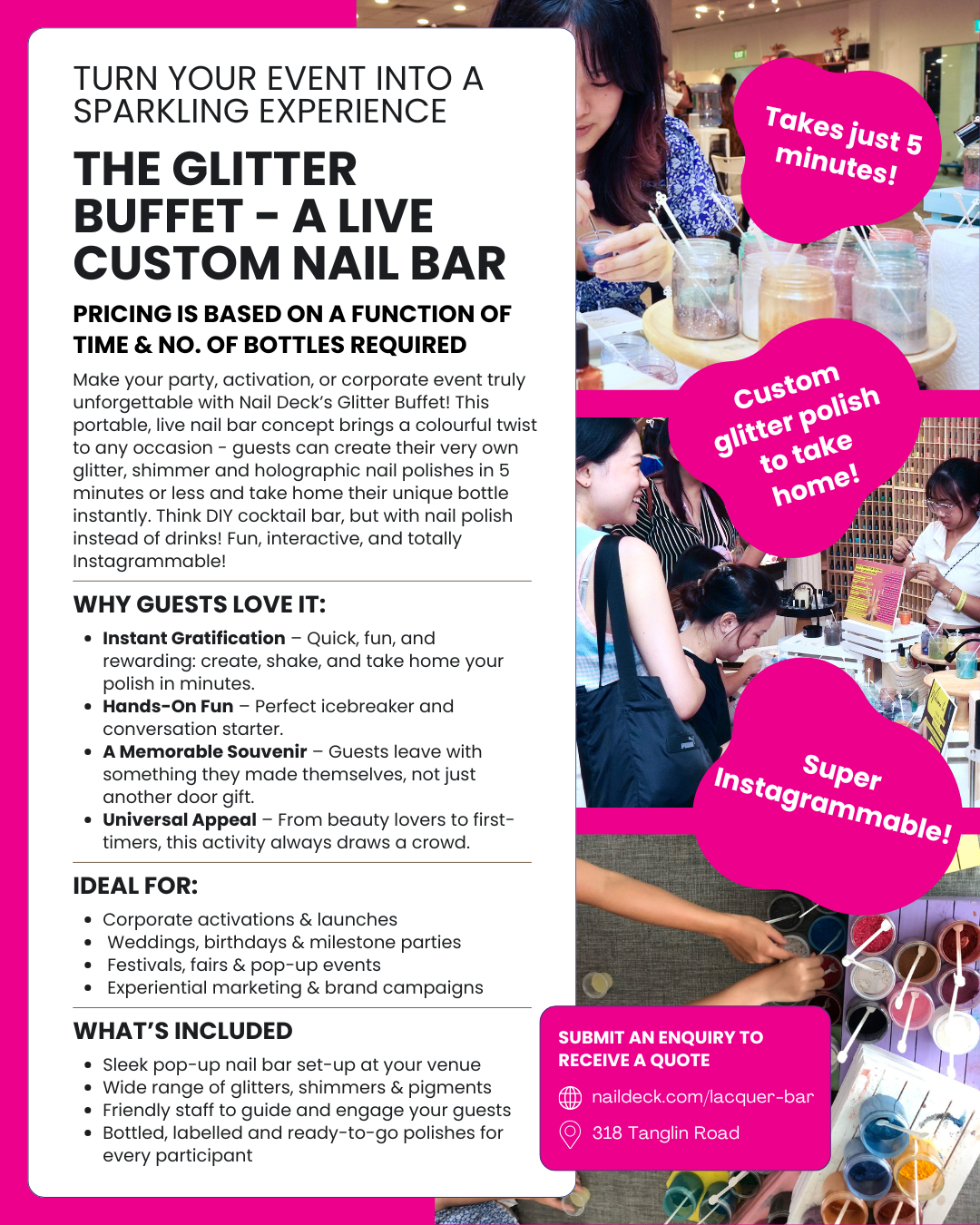 It usually takes guests about 5 - 10 minutes to create their own custom nail polish and they always leave with a super big smile on their face!