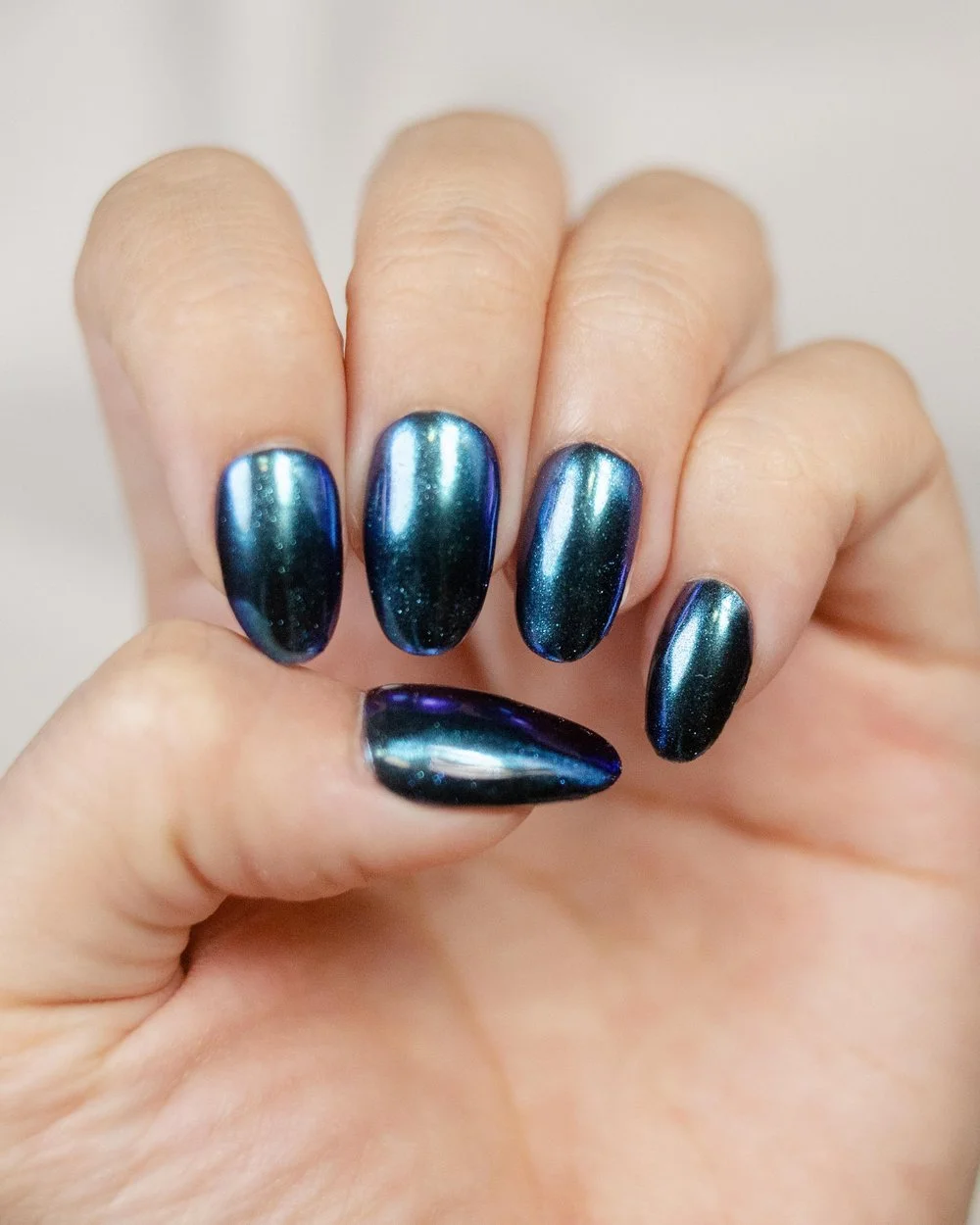 NOTE: This product is a duo chrome powder pigment that needs to be applied on. To achieve the effect in these swatches, first apply two thin layers of Light Lacquer (and cure after each layer). Next, unscrew the cap of Wonder Wand and gently rub the soft cushioned tip onto the top surface of your Lacquer Lacquer layer.